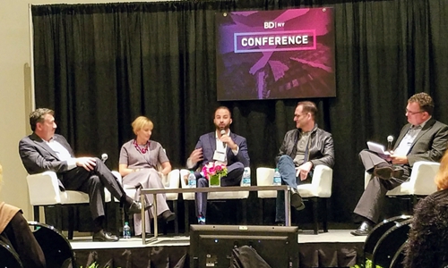 从左至右:万豪国际集团全服务特许经营高级副总裁Kip Vreeland、 ABI设计总裁Lisa Knight、Meyer Jabara酒店发展副总裁Justin Jabara、希尔顿酒店及度假村全服务品牌建筑与设计副总裁Vito Lotta、LWHA资产和物业管理服务总裁Gary Isenberg